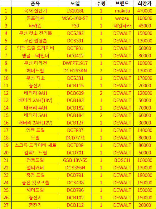 안녕하세요.회사에서 몇 번 안 쓴 전동 공구 판매합니다. 목록과 가격은 사진 확인 부탁드리며 개별 사진은 첨부 파일 확인 부탁드립니다. 개별 판매도 가능하며 일괄 매입시 가격 협의 가능합니다. 거래는 가산디지털단지역 11번 출구 제이플라츠에서 직거래만 가능하며 계좌이체로 거래 원합니다.