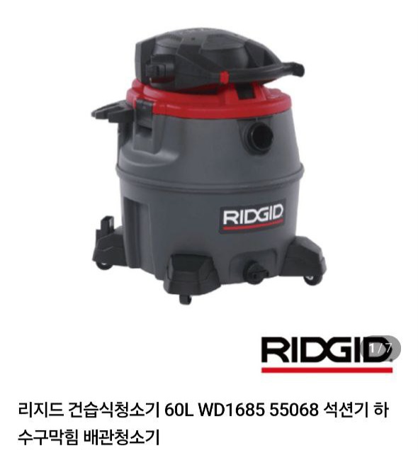 리지드 건습식 청소기 60L 모델 WD1685입니다 강력한 흡입력으로 다양한 청소 환경에 적합합니다 석션기능으로 하수구 막힘이나 배관 청소에도 유용합니다 한번사용함 010 7778 7868