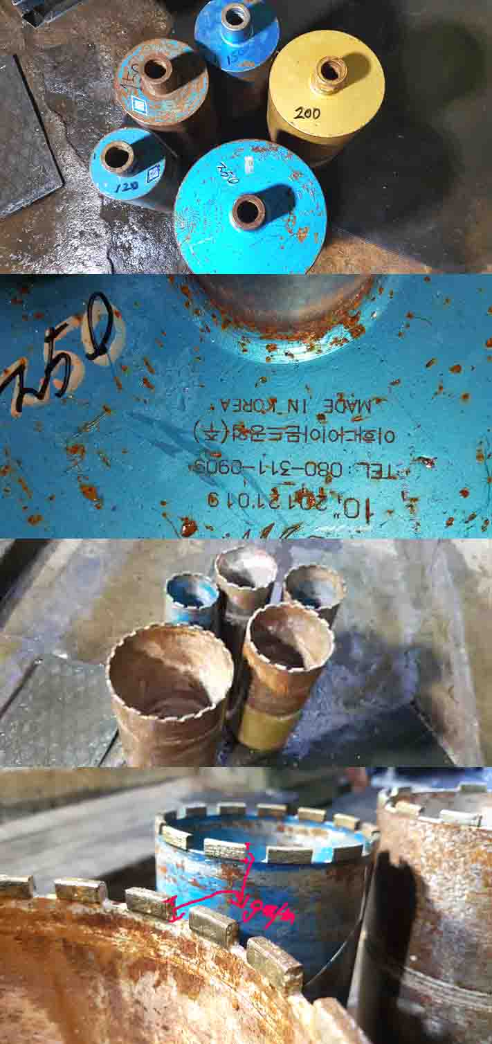국산 이화 천일 코어비트 입니다 코어날 상태가 양호 합니다 많이 사용하지않았읍니다 비트날 상태가 아주 양호 합니다 제원:250m/m.1개 200m/m 1개 150m/m2개 120m/m 1개 사진은 실사 입니디ㅏ 가격:25만원 화물착불 연락처:010-5251-1533 이기수 기업은행:260-000893-03-012
