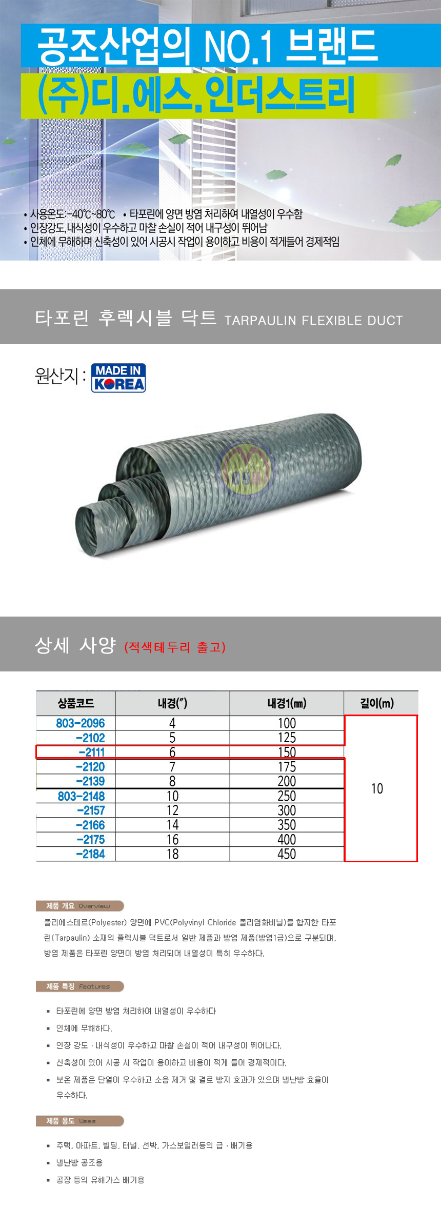 타포린 후렉시블 닥트 150mm 디에스인더스트리,공구몰,내열성우수,8032111