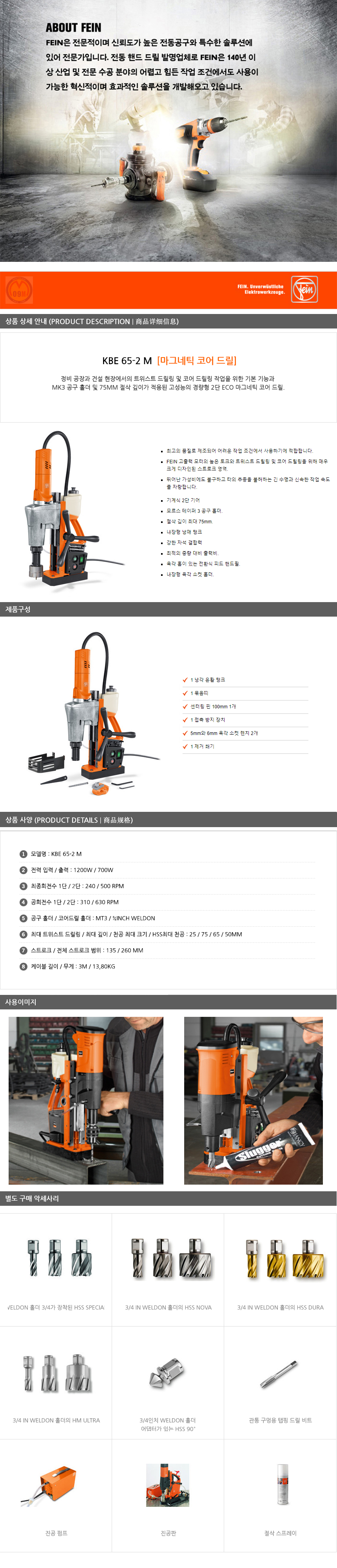 파인 마그네틱코어드릴 KBE65-2M , 마그드릴, FEIN, 코아드릴 , 천공작업