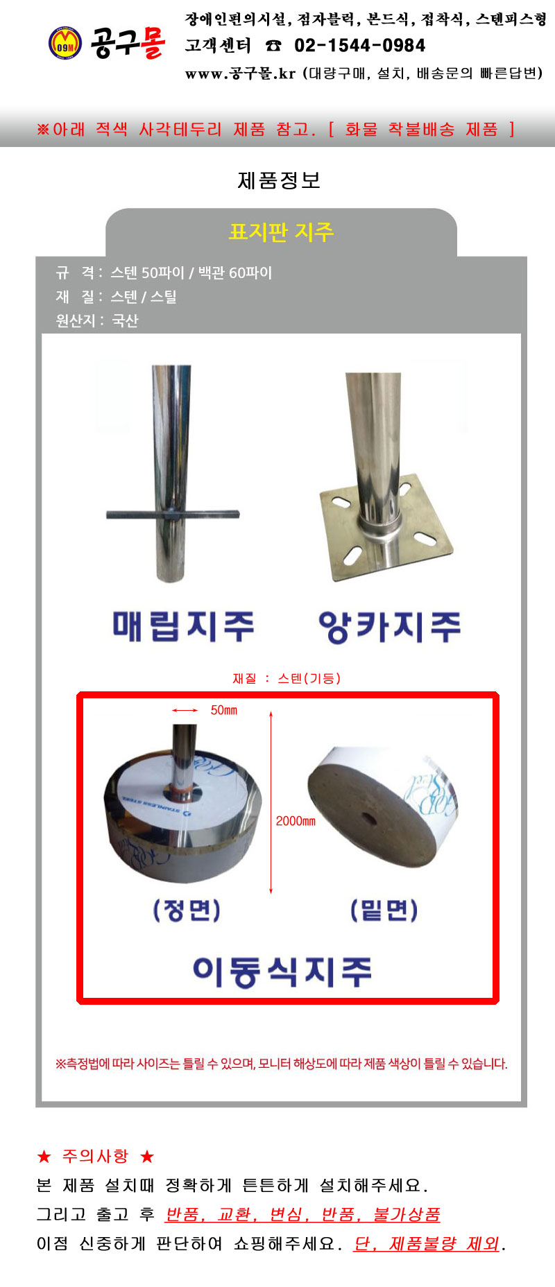 완성 스텐이동식 지주(기둥) 50xH2000 완성(39) 주차, 금지, 표지판기둥
