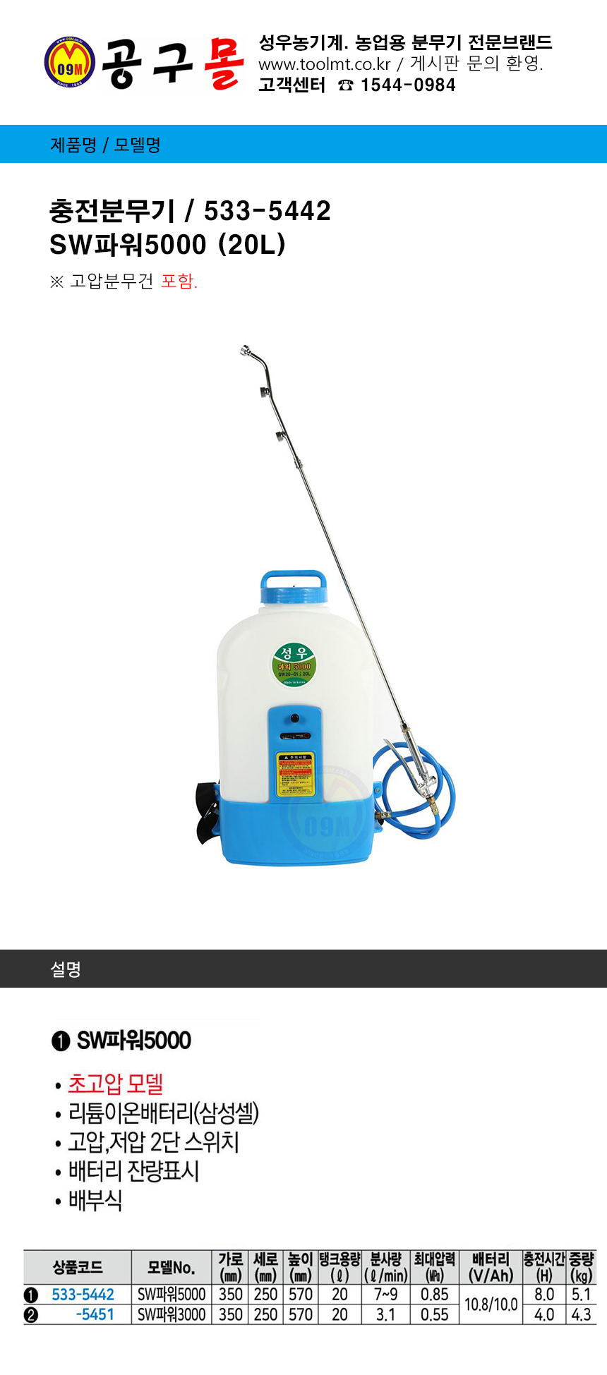 충전분무기 SW파워5000 (20L) 10.8V-10Ah, 고압건포함, 성우농기계, 5335442