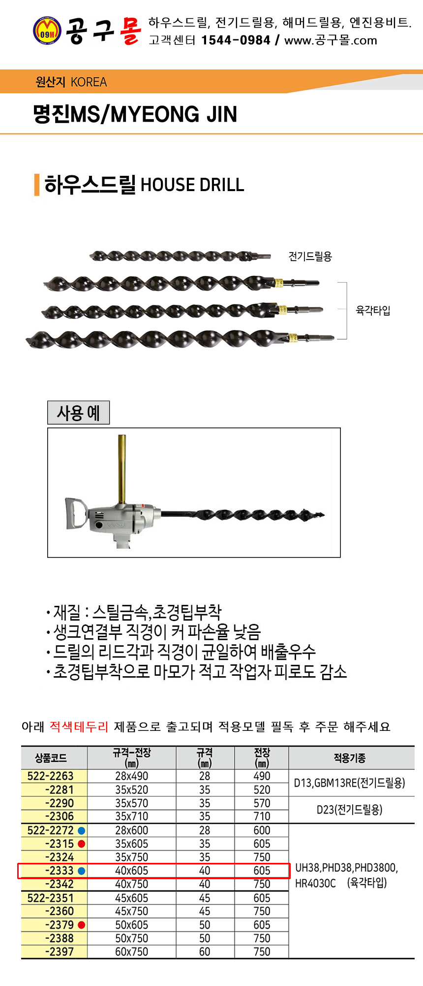 하우스드릴 40mmx605mm (육각타입, UH38,PHD38,PHD3800, HR4030C용) 명진ms, 파이프드릴, 하우스길이, 공구몰▲