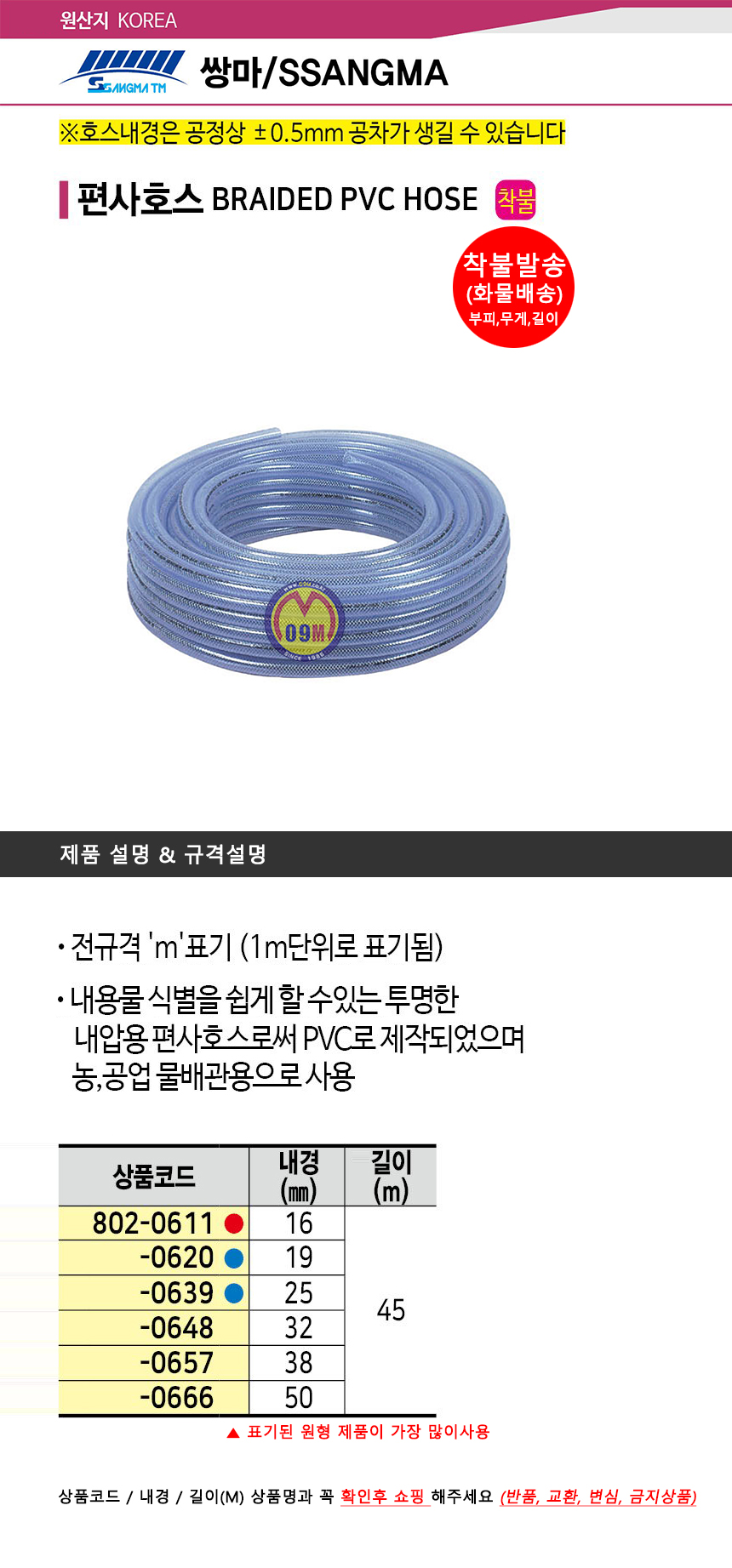 편사호스(롤) 16MMx45M 쌍마,물호스, 수도호스, 공구몰, 802-0611