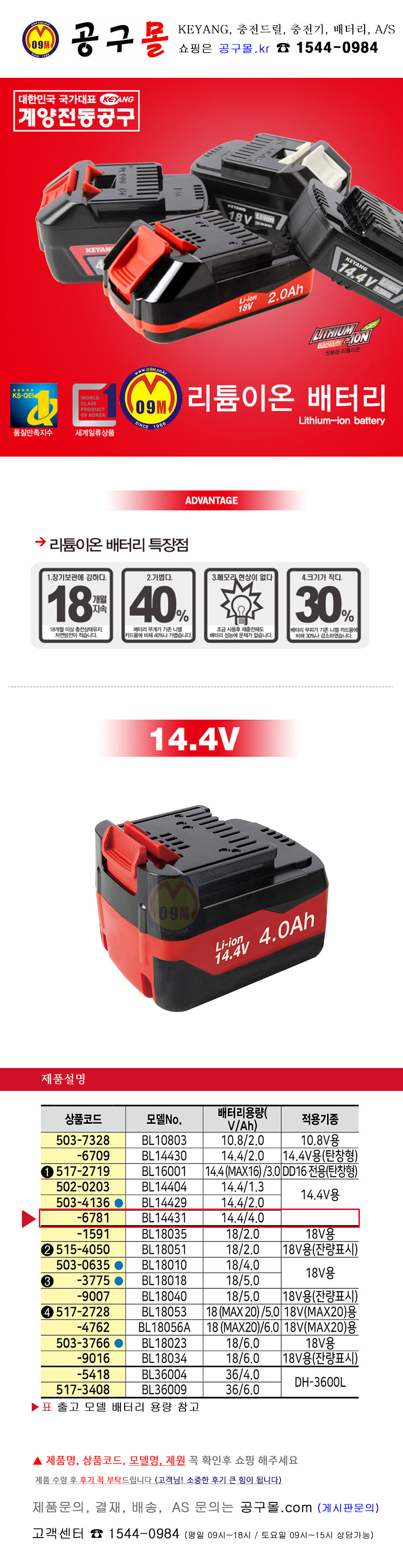 계양 리튬 배터리 BL14431(14.4V/4.0Ah), KEYANG, 계양, 공구몰, 503-6781