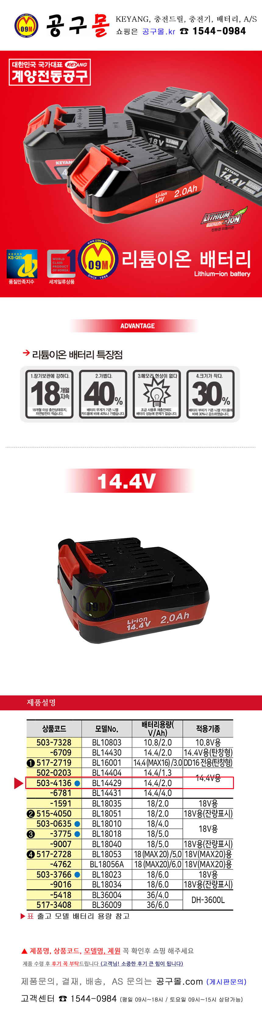 계양 리튬 배터리 BL14431(14.4V/4.0Ah), KEYANG, 계양, 공구몰, 503-6781