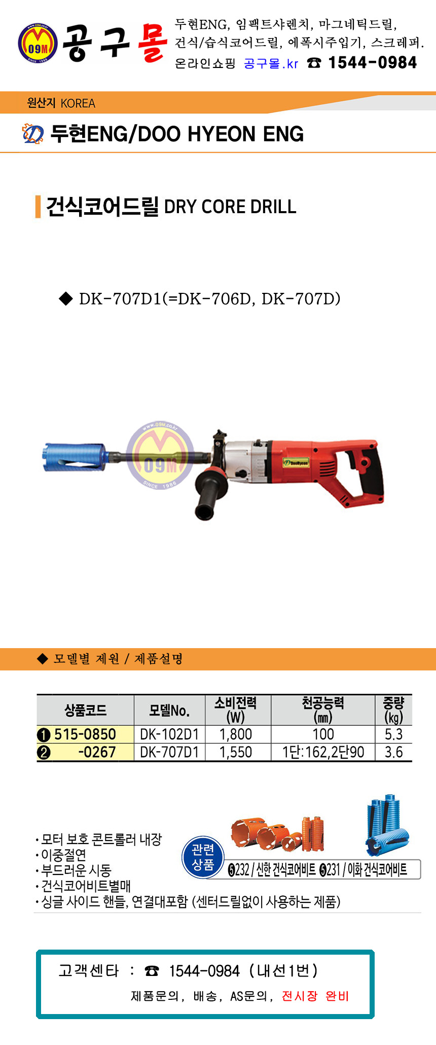두현ENG 건식코어드릴 DK-707D1 공구몰, 코어드릴, 건식코아드릴, 515-0267