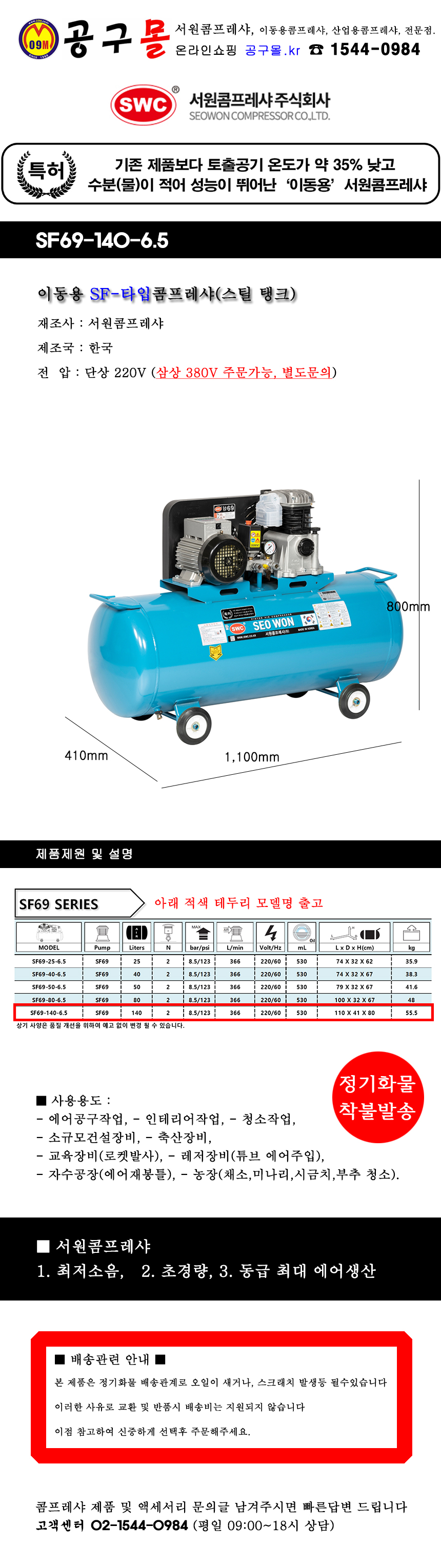 서원콤프레샤 SF타입 SF69-140-6.5 (스틸140L) 220V 콤프레셔, 저소음, 초경량, 스틸탱크, 공구몰