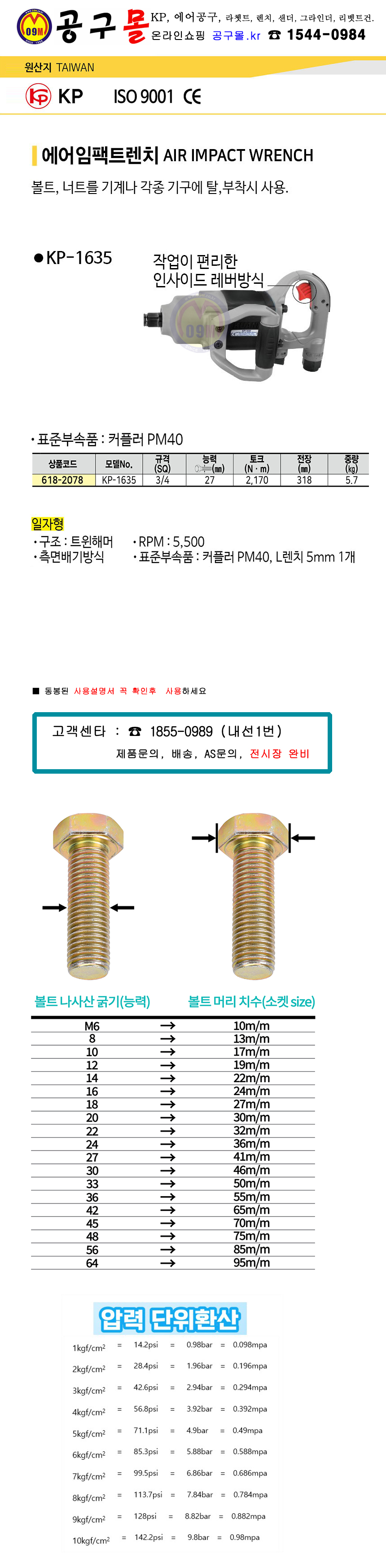 KP 에어임팩트렌치 KP-1635(3/4SQ)일자형 에어공구, 임팩트렌치, 에어렌치, 공구몰 618-2078