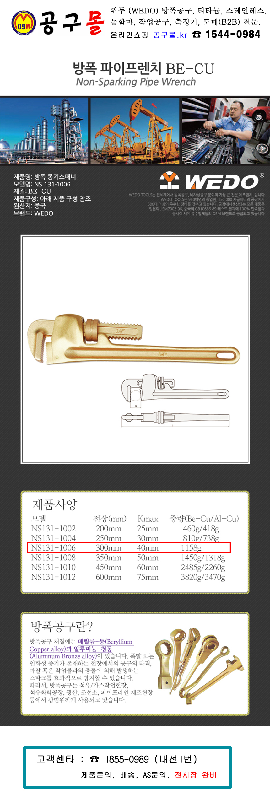 위두 방폭파이프렌치(BE-CU) 300mm NS131-1006 WEDO, 공구몰, 방폭수공구, 작업공구, 800564143188