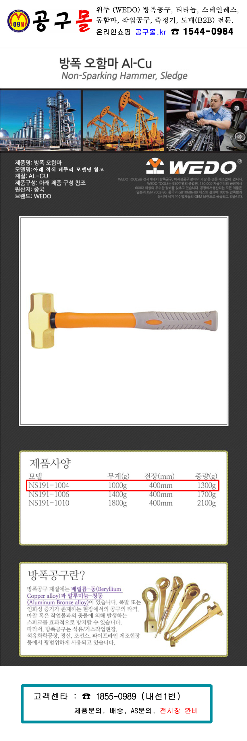 위두 방폭오함마 AL-CU 1.8Kgs / 4LBS (NS191-1010) WEDO, 공구몰, 방폭수공구, 작업공구, 800564253795