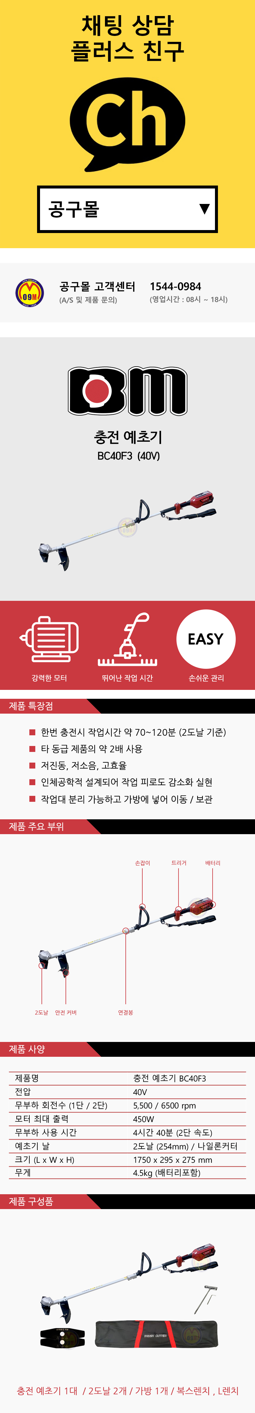 북성-40V 충전예초기 BC40F3 (베어툴) (배터리, 충전기별매)예취기, 제초, 벌초, 공구몰