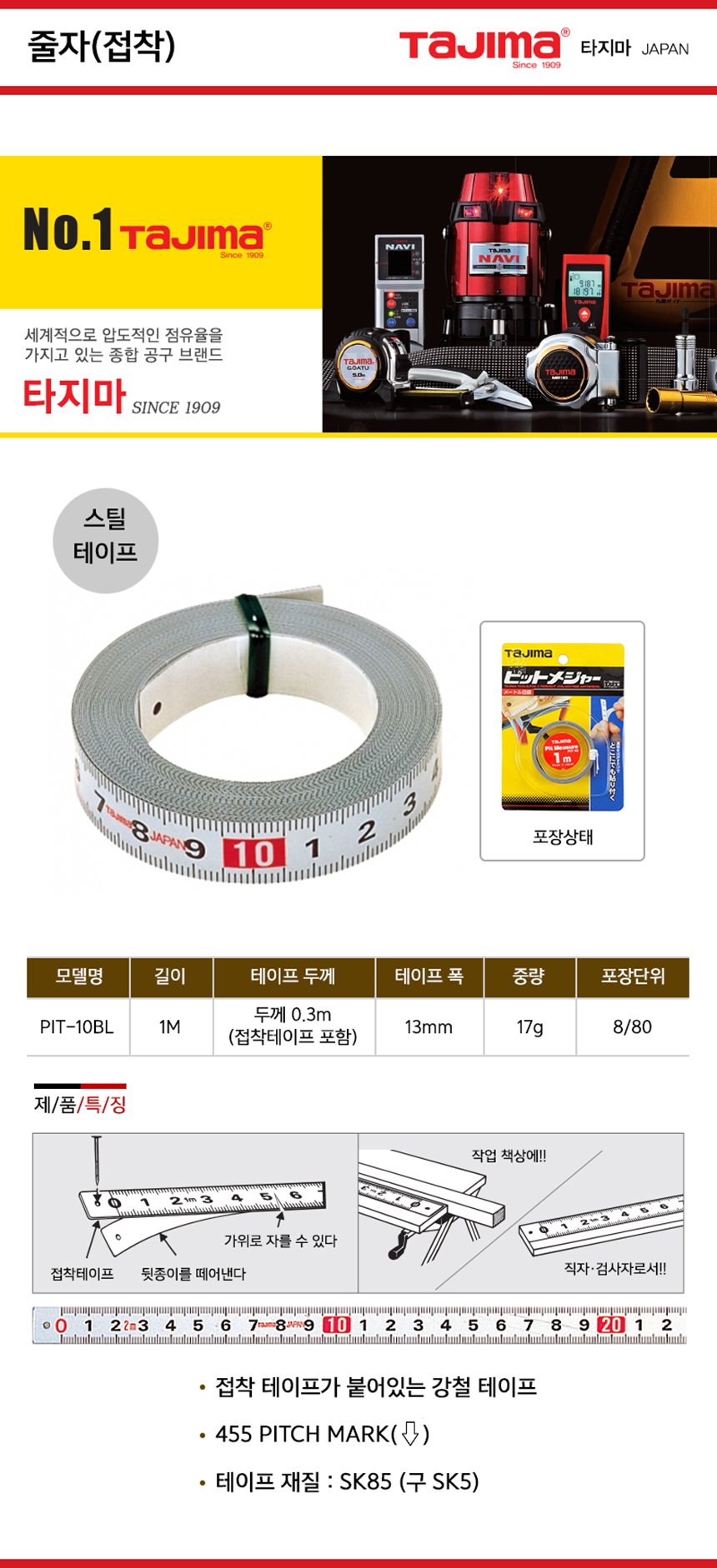 타지마 줄자(접착) PIT-10BL 1M, TAJIMA , 접착식줄자, 141402450271