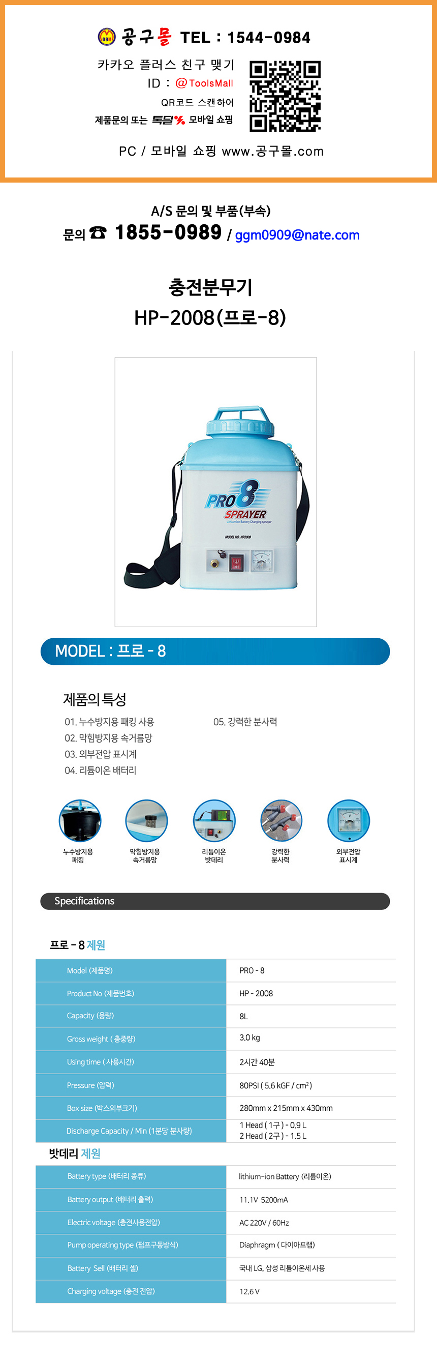 한일 충전분무기 HP-2008(프로-8) 8L 무선분무기전문, 한일에스피 울산 공구몰 닷컴 533-5275