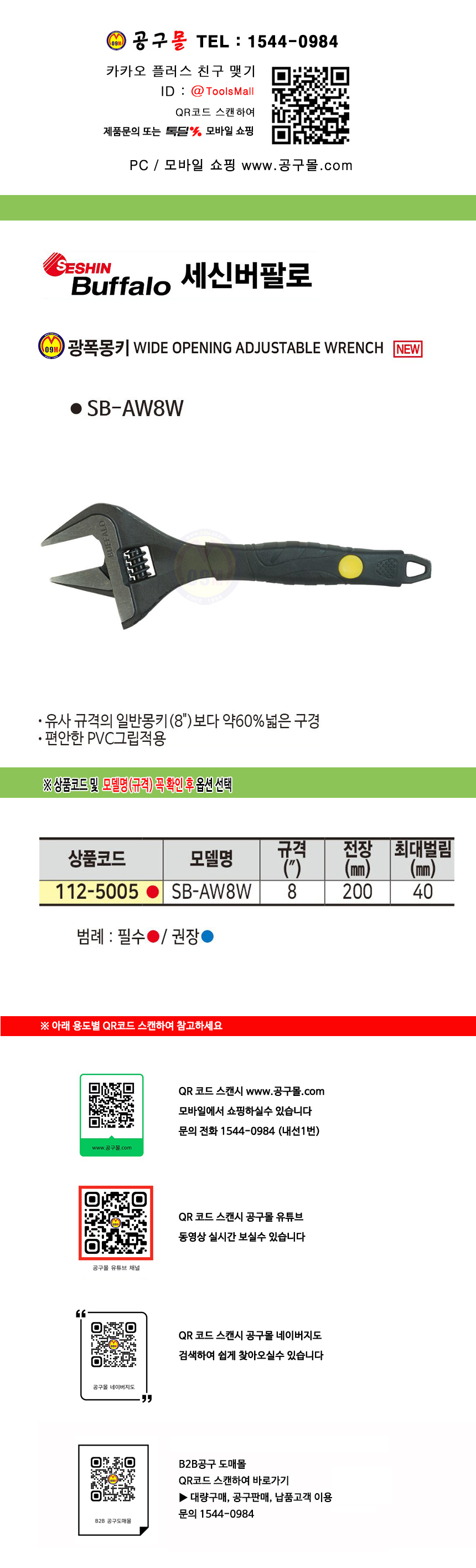 세신 광폭몽키 SB-AW8W 몽키스패너, SESHIN BUFFALO, 세신공구, 버팔로 공구몰 112-5005