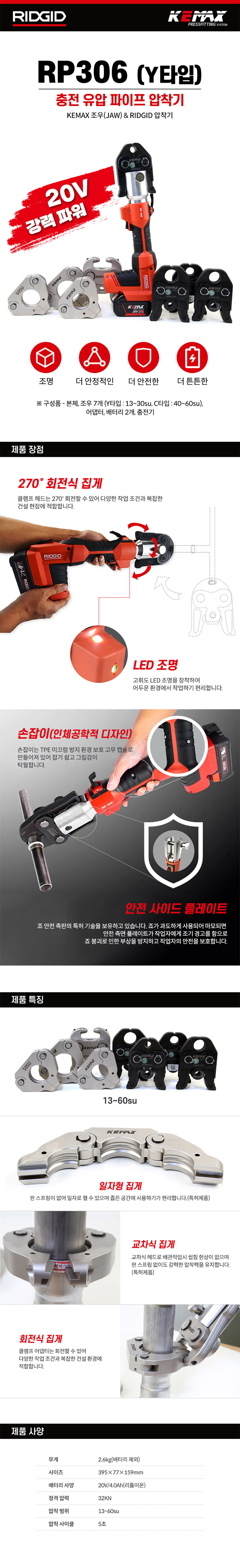 케맥스 충전배관압착기(SET) RP306-Y 13-60SU 20V 6.0Ah 2팩 Y타입 배관공구 RP306Y-60SU