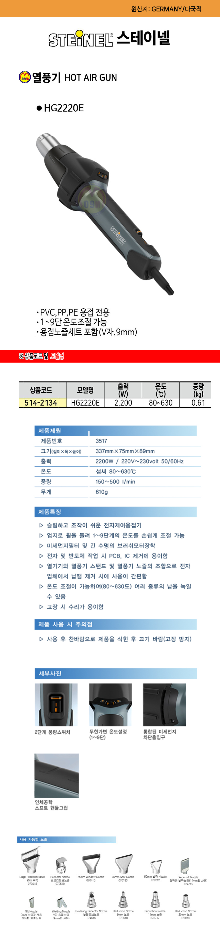 스테이넬 열풍기(용접) HG-2220E 2200W 80-630도 PVC, PP, PE용접 STEINEL 514-2134