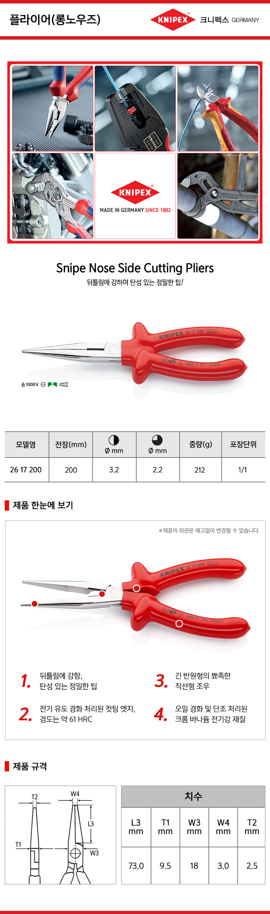 크니펙스 플라이어(롱노우즈,절연) 26-26-200, 26-26-200SB KNIPEX 독일공구 공구몰 101001020098