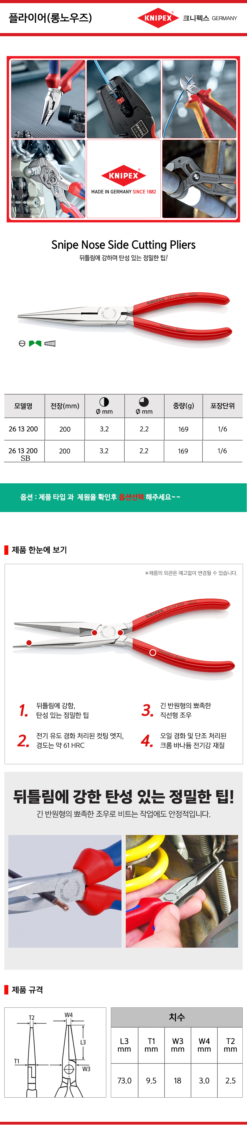 크니펙스 플라이어(롱노우즈,절연) 26-26-200, 26-26-200SB KNIPEX 독일공구 공구몰 101001020098