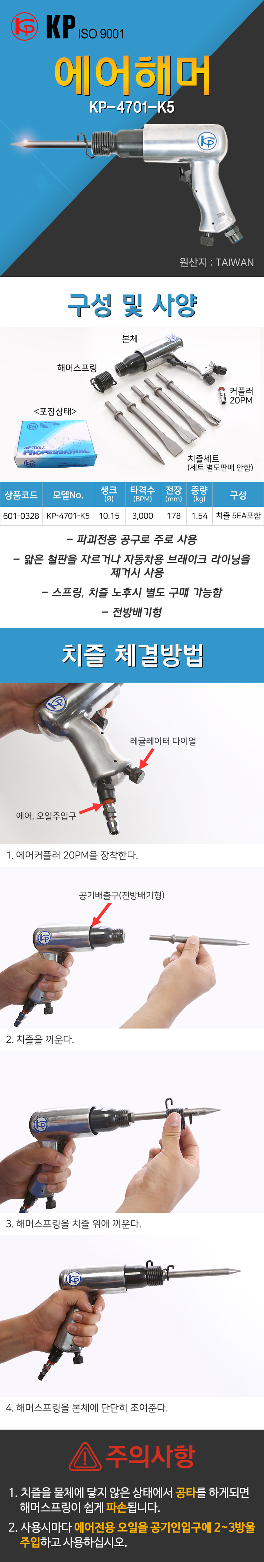 KP 에어해머세트 KP-4701K5 (5p) 샹크10.15mm 178mm 1.54Kg 에어공구, 에어해머, 다가네 공구몰 601-0328