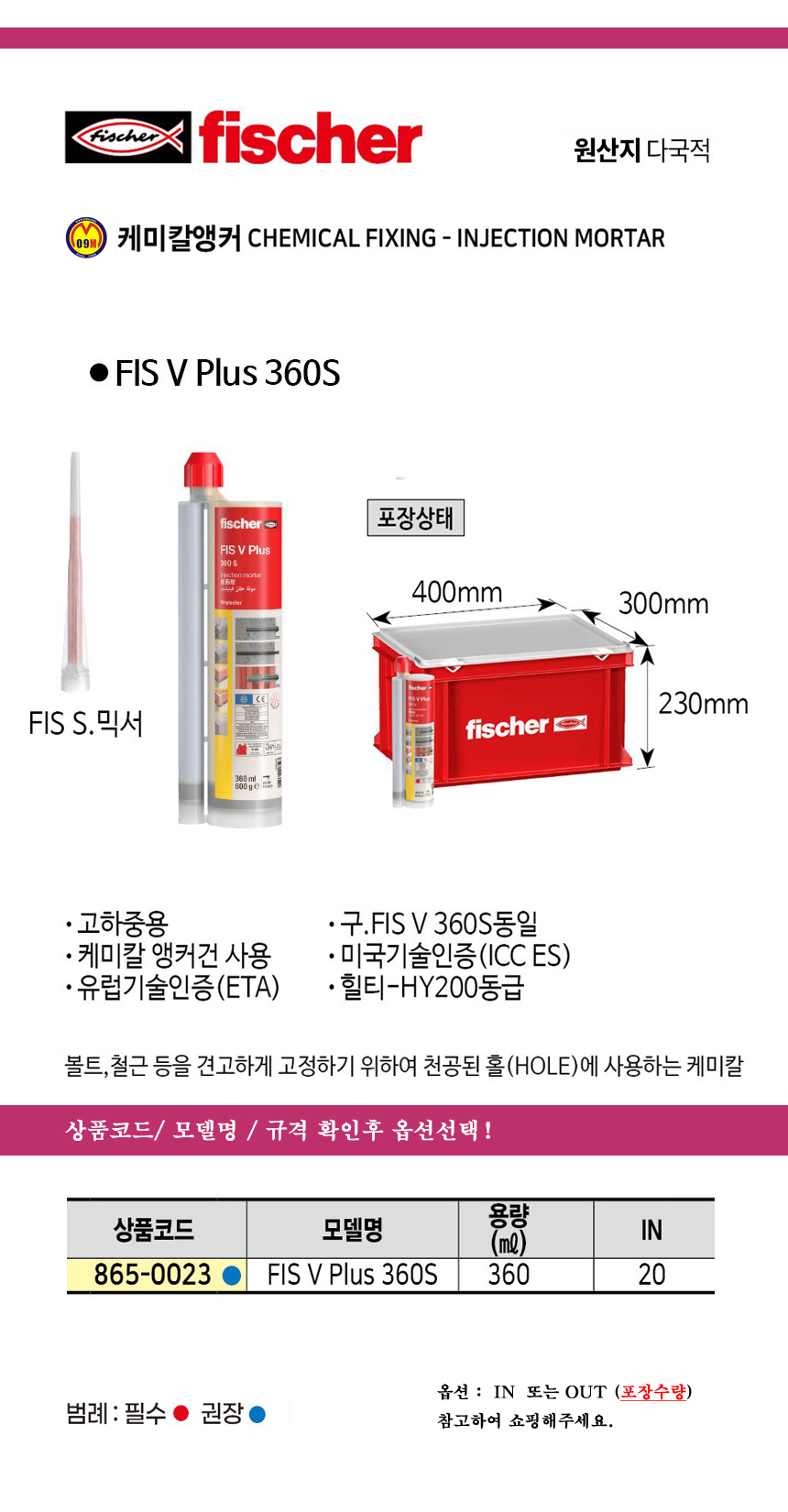 피셔 케미칼앵커 FIS V Plus 360S-2액형/ NO.558748(360ML,고하중용) fischer, 공구몰 865-0023