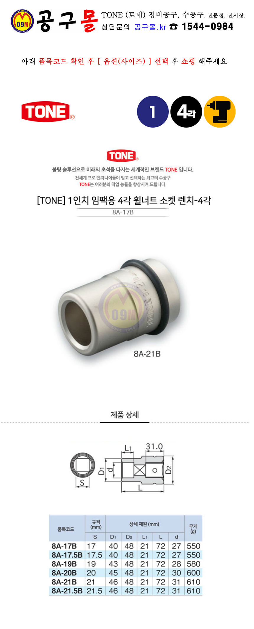TONE 1inch-4각 임팩 휠너트 소켓(72mm) 8A-17B/21.5B (17-21.5mm) 토네, 복스알, 공구몰