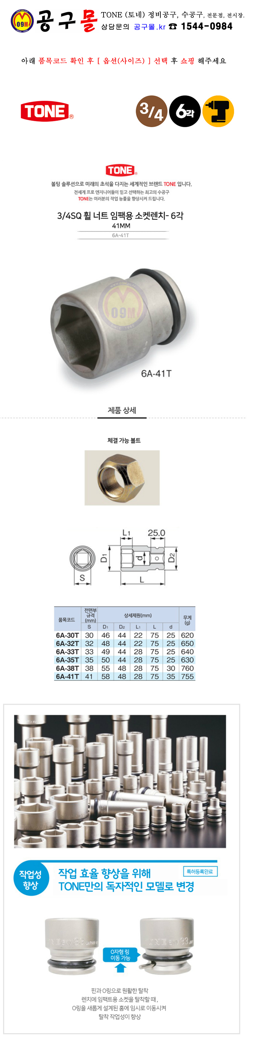 TONE 3/4-4각 임팩 휠너트 소켓(75mm) 6A-30T/41T (30-41mm 토네, 타이어 복스알, 공구몰