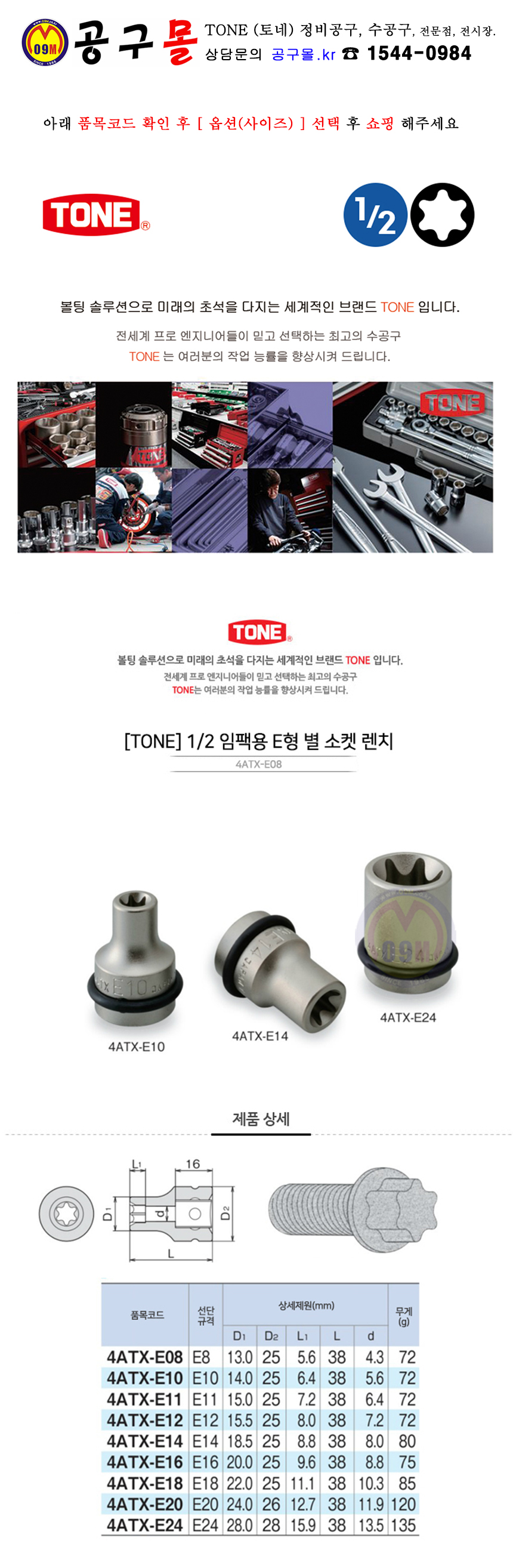 TONE 1/2 임팩 E형 별소켓(38mm) 4ATX-E08/E24 (E08-E24) 토네, 별복스알, 공구몰