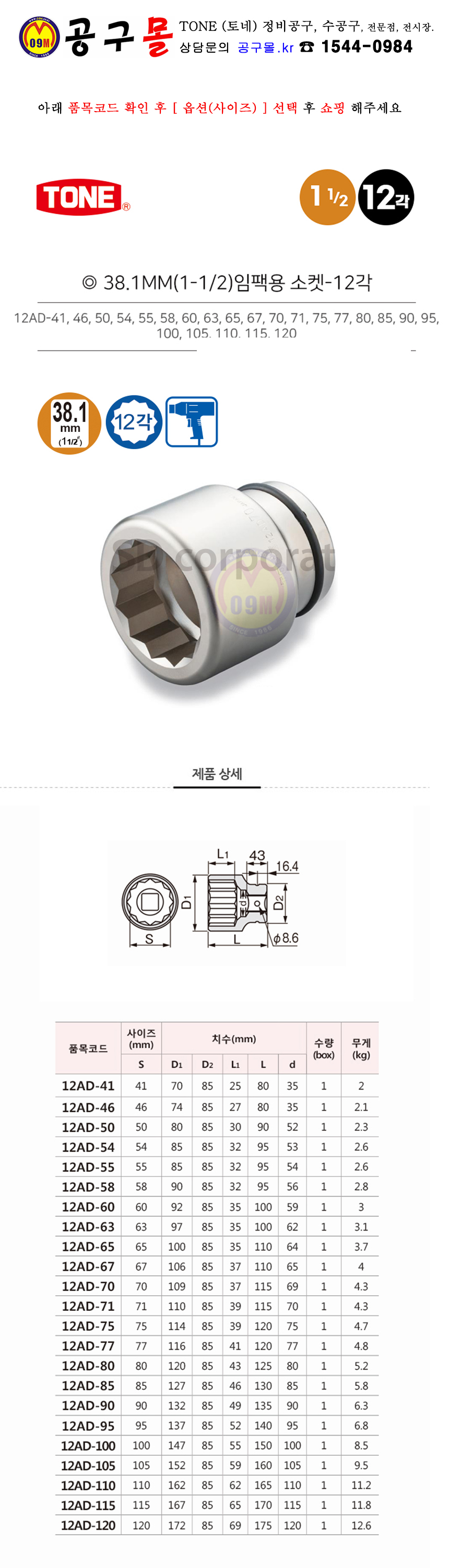 TONE 1-1/2-12각 임팩소켓(041-65mm) 12AD-41/65 (41-65mm 토네, 복스알, 공구몰, 812AD-41