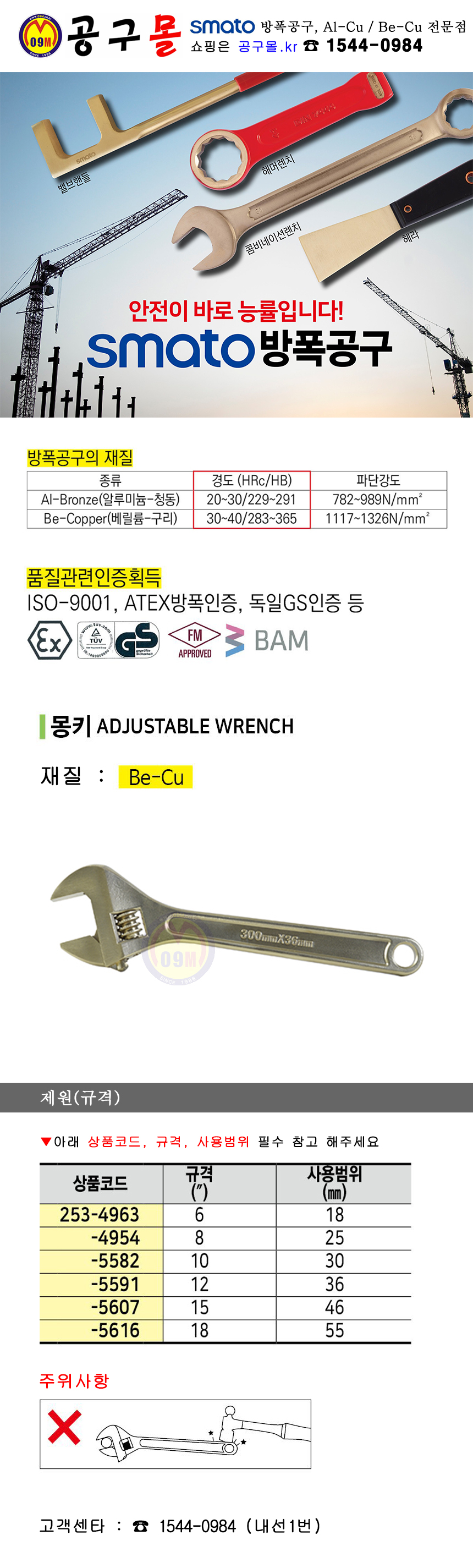 세신 몽키(방폭) Be-Cu 150mm (6) - 250mm (10) SESHIN BUFFALO, 몽키스패너, 253-4963