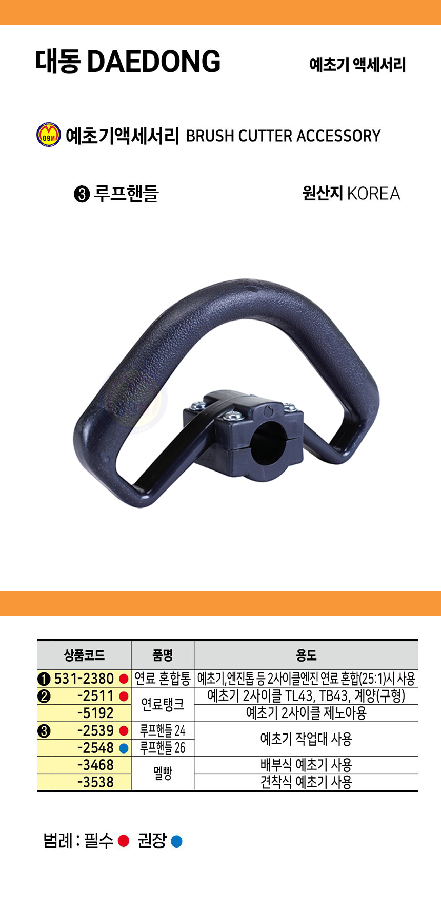 대동 예초기 루프핸들 (손잡이) 24mm/ 26mm , 부품, 부속 공구몰 531-2539