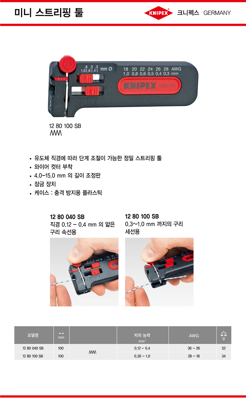 크니펙스 스트립퍼(자동) 12-80-040SB, 12-80-100SB 자동스트리퍼 전석박피공구 전기 통신공구, Knipex 독일공구, 수공구 작업공구 공구몰 101011380049