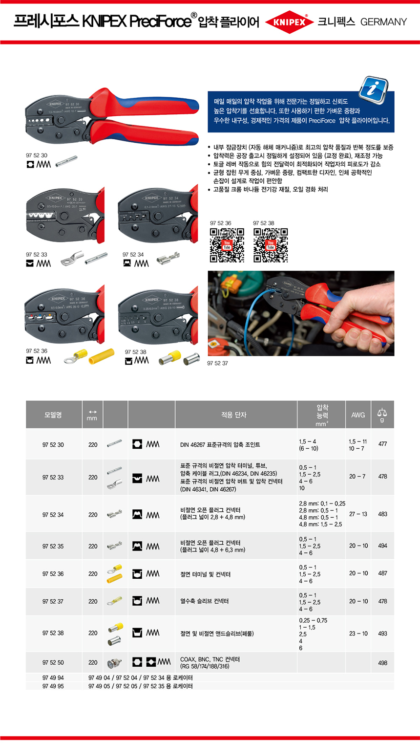 크니펙스 압착기 97-52-04 (0.1-2.5mm 압착) Knipex 터미널압착기 커넥터압착 레버식 101011370121