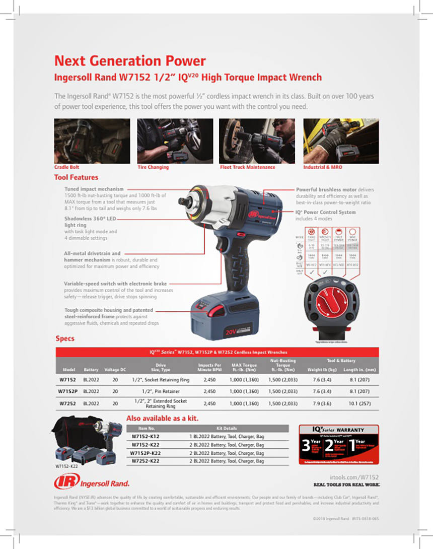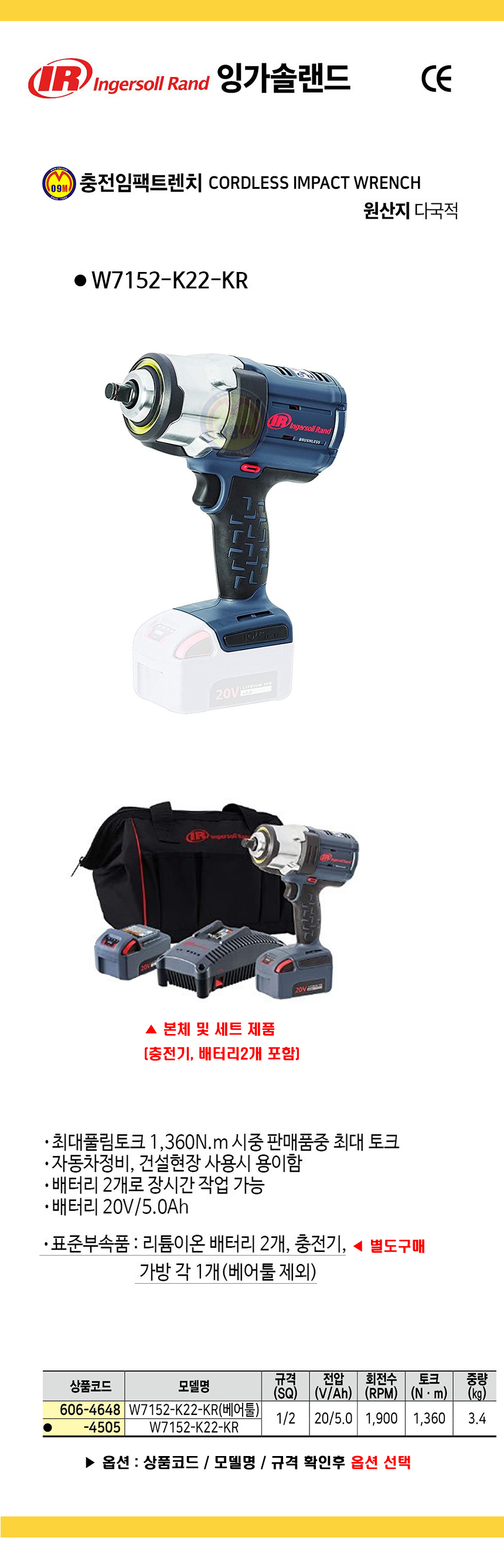 잉가솔랜드 충전임팩트렌치 W7152-K22 (베어툴, 20V 5.0Ah 2B) (1/2SQ) INGERSOLL RAND 공구몰 추천 C606-4648