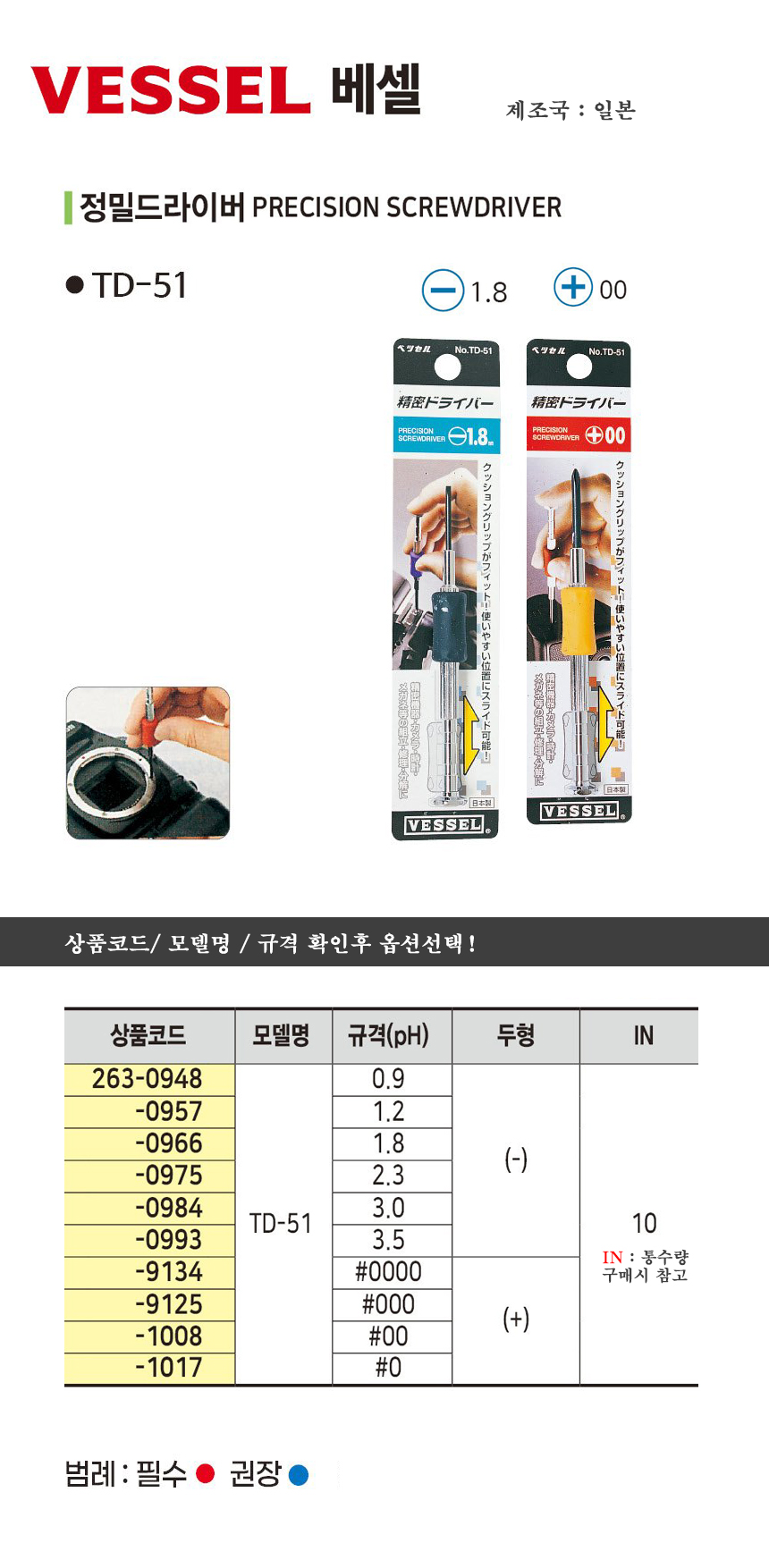 베셀 정밀드라이버 TD-51 (0.9mm일자)/ x0(십자) VESSEL