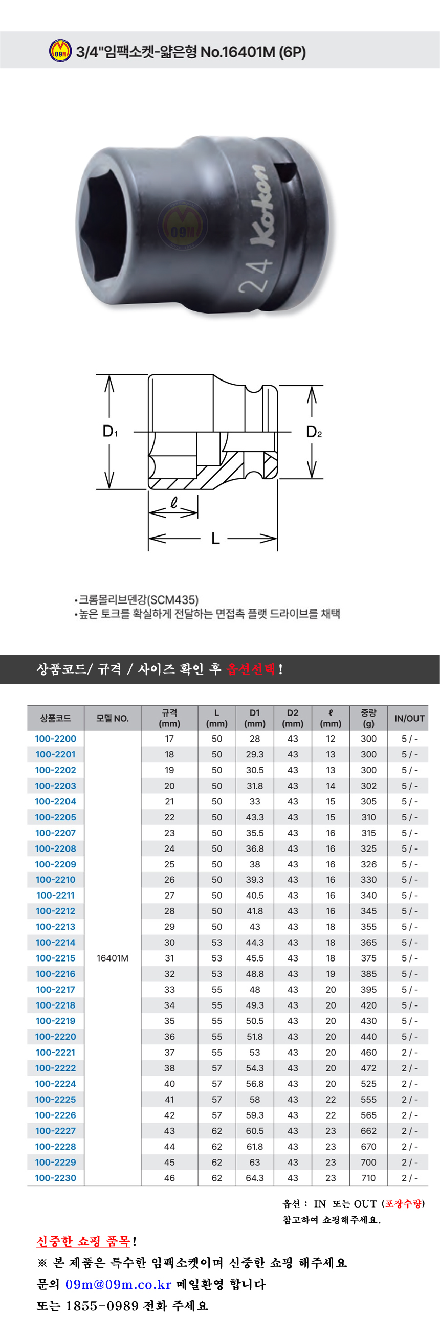 코켄 임팩소켓 얇은형 16401M 6P 3/4x(17mm, 46mm) KOKEN, 대형소켓 100-2200