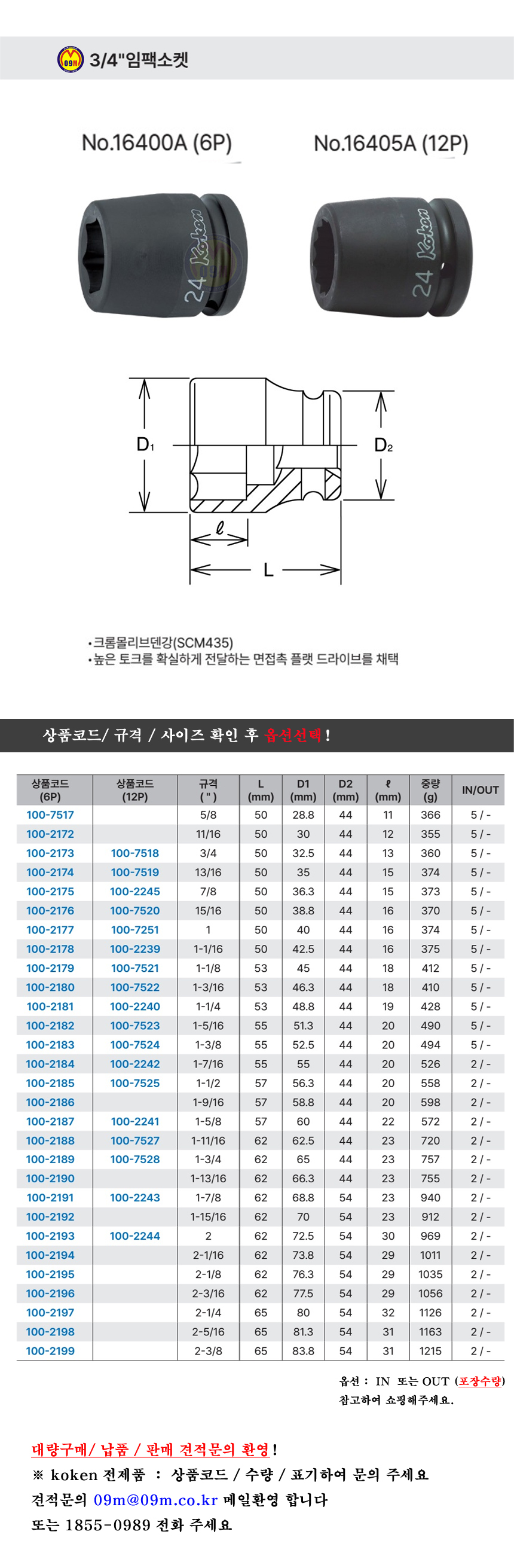 코켄 임팩소켓 16400A/16405A 3/4(5/8, 1-1/2) 6P/12P KOKEN, 임팩복스알 100-7517