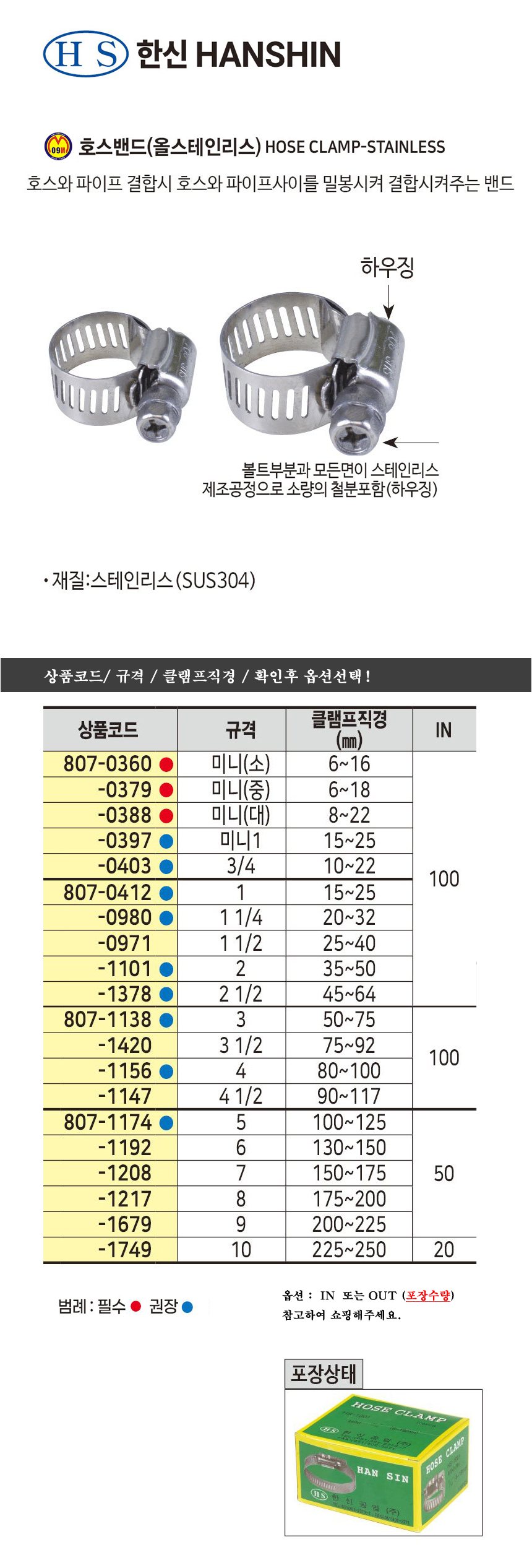 한신 호스밴드(SUS304) 5 (100-125mm), 7 (150-175mm) 규격선택 볼트형태